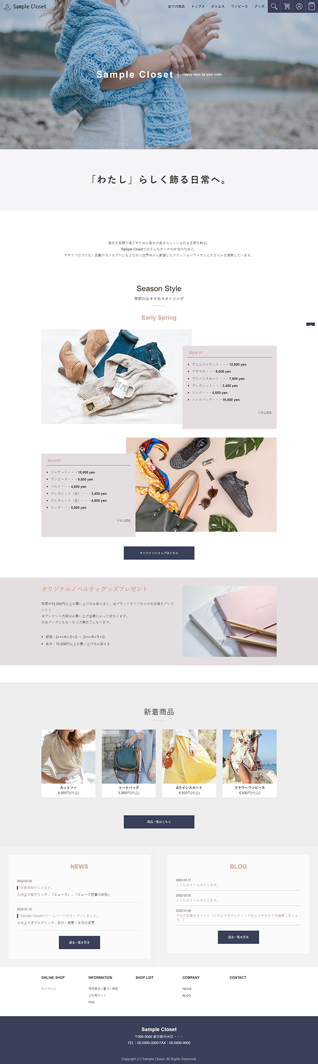 こちらのテンプレートを選んで登録すると「アパレルショップ(EC)」のサイトが作成できます。後は文章を入れ変えたり、写真を入れ替えるだけで完成です。